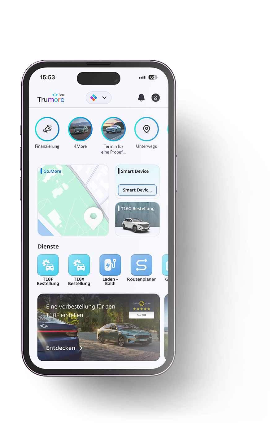 Mit der Trumore App erleben Sie Mobilität neu – und können Ihre Togg FahrzeugFinanzierung direkt digital beantragen. Ob vom Smartphone oder Tablet: In nur wenigen Minuten erhalten Sie Ihre Vorabgenehmigung über das Finanzierungsportal der KT Bank – schnell, sicher und komplett papierlos.